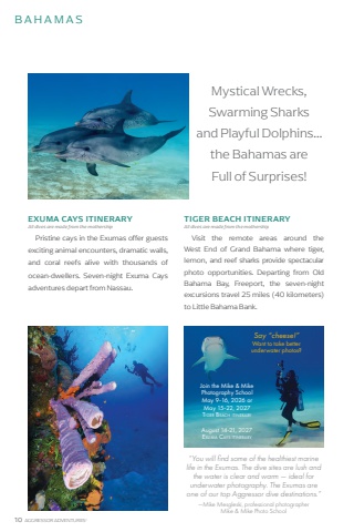 10 AGGRESSOR ADVENTURES%u00aeTIGER BEACH ITINERARYAll dives are made from the mothershipVisit the remote areas around the West End of Grand Bahama where tiger, lemon, and reef sharks provide spectacular photo opportunities. Departing from Old Bahama Bay, Freeport, the seven-night excursions travel 25 miles (40 kilometers) to Little Bahama Bank. BAHAMASSay %u201ccheese!%u201d Want to take better underwater photos? %u201cYou will find some of the healthiest marine life in the Exumas. The dive sites are lush and the water is clear and warm %u2014 ideal for underwater photography. The Exumas are one of our top Aggressor dive destinations.%u201d%u2014Mike Mesgleski, professional photographer Mike & Mike Photo School Join the Mike & Mike Photography School May 9-16, 2026 or May 15-22, 2027 Tiger Beach itineraryAugust 14-21, 2027Exuma Cays itineraryMystical Wrecks, Swarming Sharks and Playful Dolphins...the Bahamas are Full of Surprises!EXUMA CAYS ITINERARYAll dives are made from the mothershipPristine cays in the Exumas offer guestsexciting animal encounters, dramatic walls, and coral reefs alive with thousands of ocean-dwellers. Seven-night Exuma Cays adventures depart from Nassau.